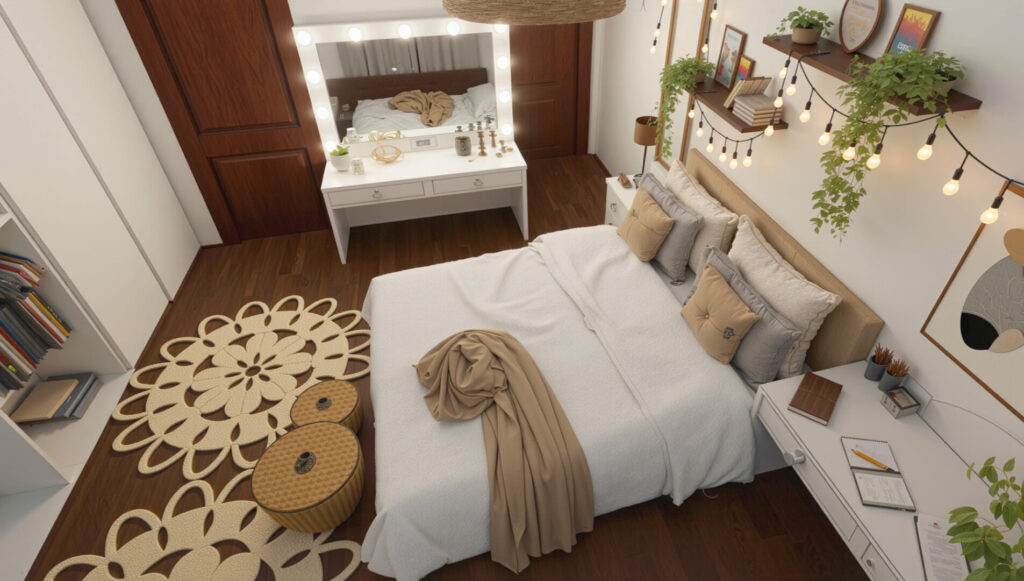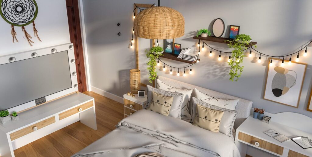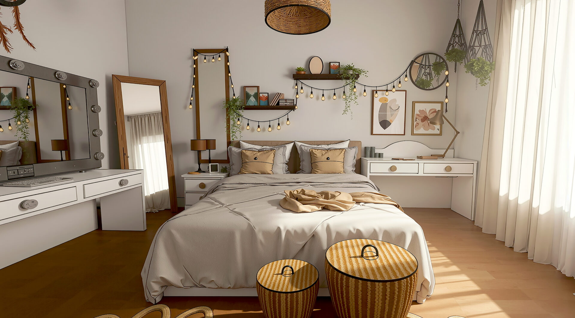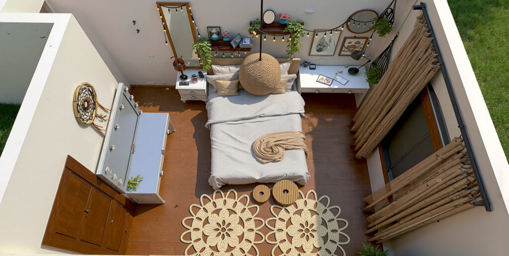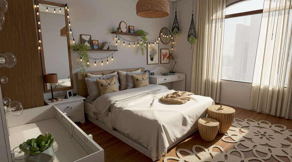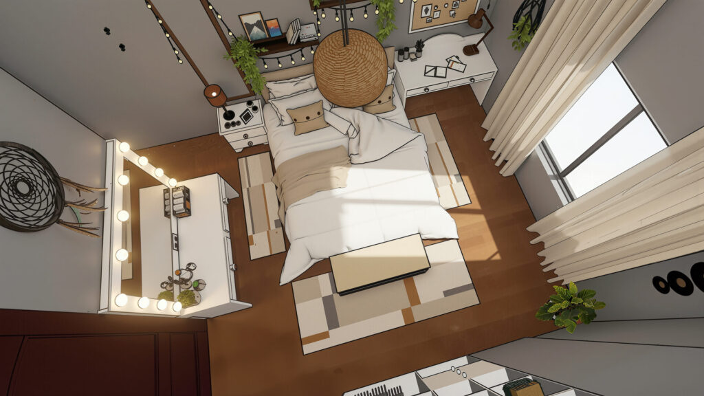 Este proyecto de dormitorio combina de manera magistral los estilos Bohemio (Boho) e Industrial para crear un espacio que es a la vez orgánico, acogedor y moderno. Se ha priorizado una atmósfera de refugio personal que invita al descanso y la creatividad.